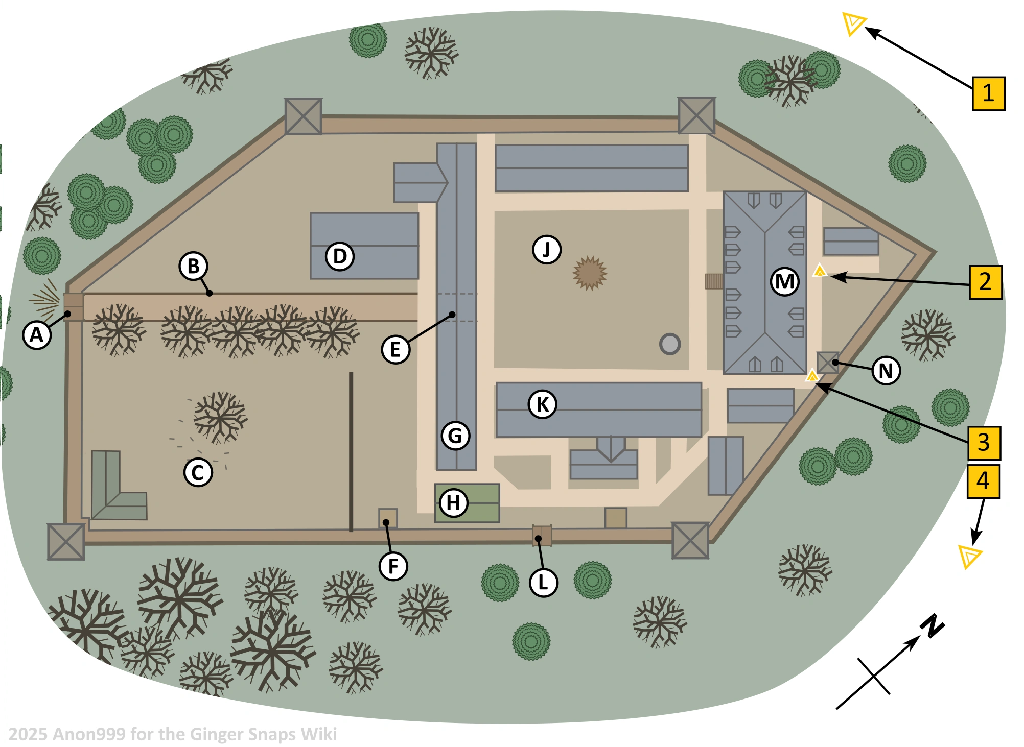 When Ginger starts looking for Geoffrey to kill him, she is seen behind (3) the main house. Visible in the background is the lattice of the watch tower (N) in the back of the main house. In the next scene she's seen walking behind a fence. The sod roof (H) in the background and the wooden braces (from D) give away the location close to the fenced entryway. Ginger then crosses over to the cemetery (C). We then see more scenes on the court yard. When the girls flee the fort they exit though the broken gate (L) next to the sod roof building.